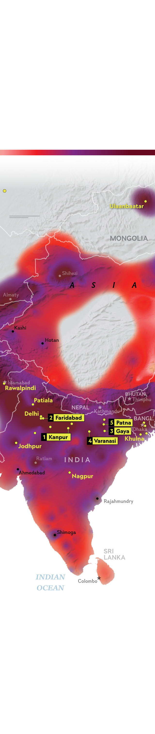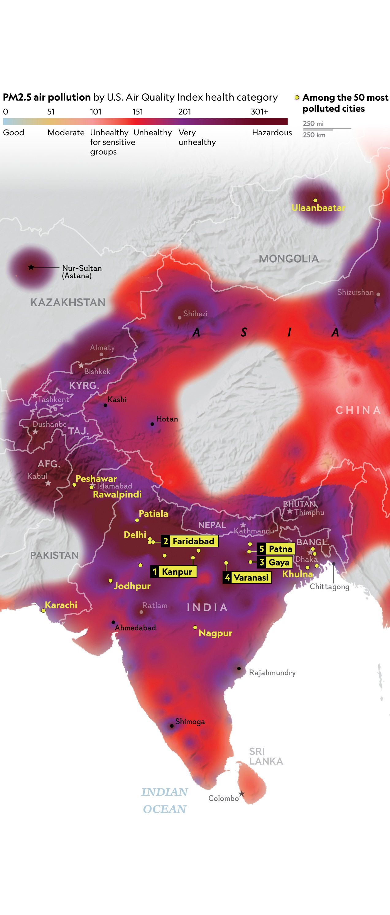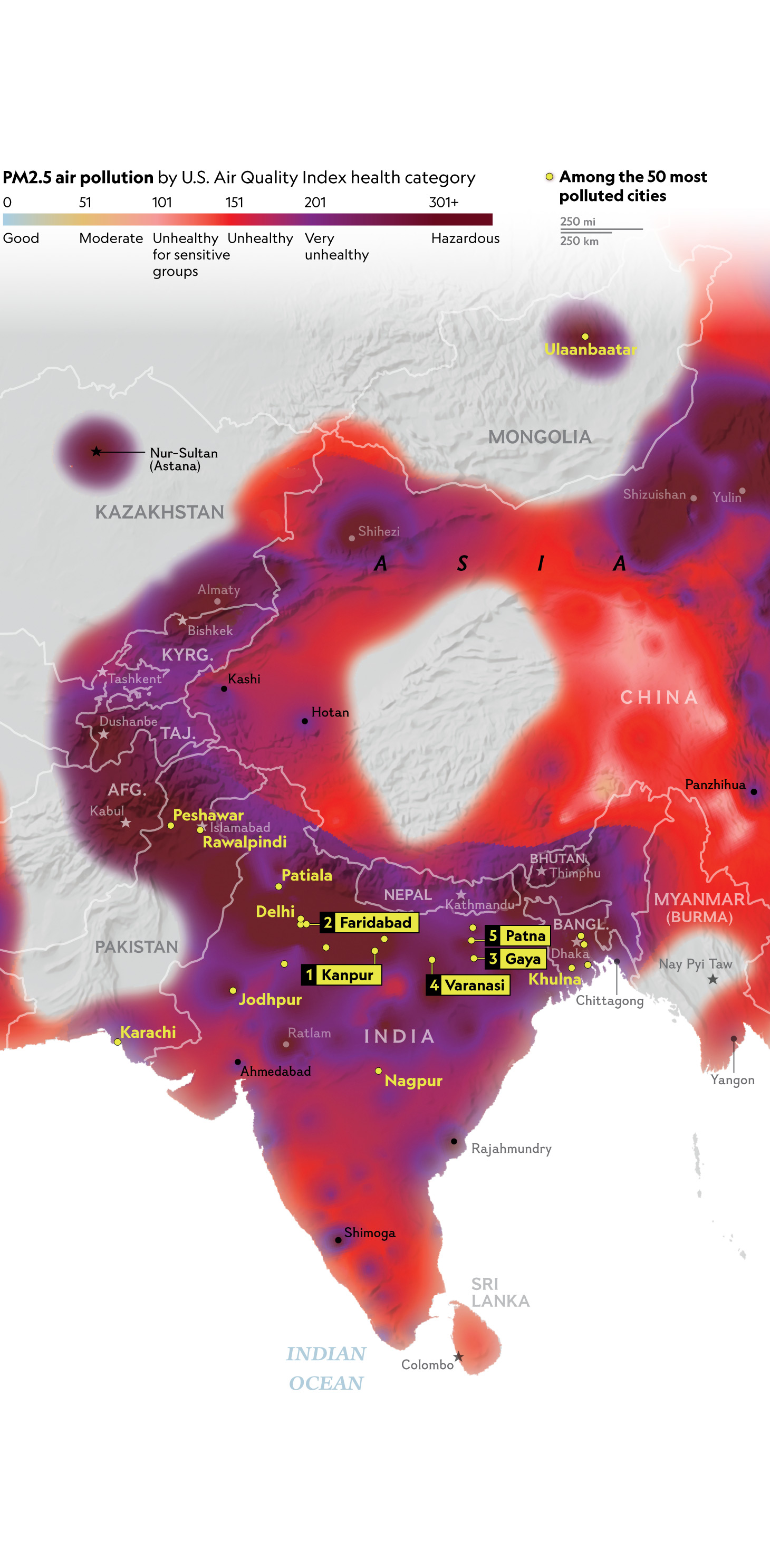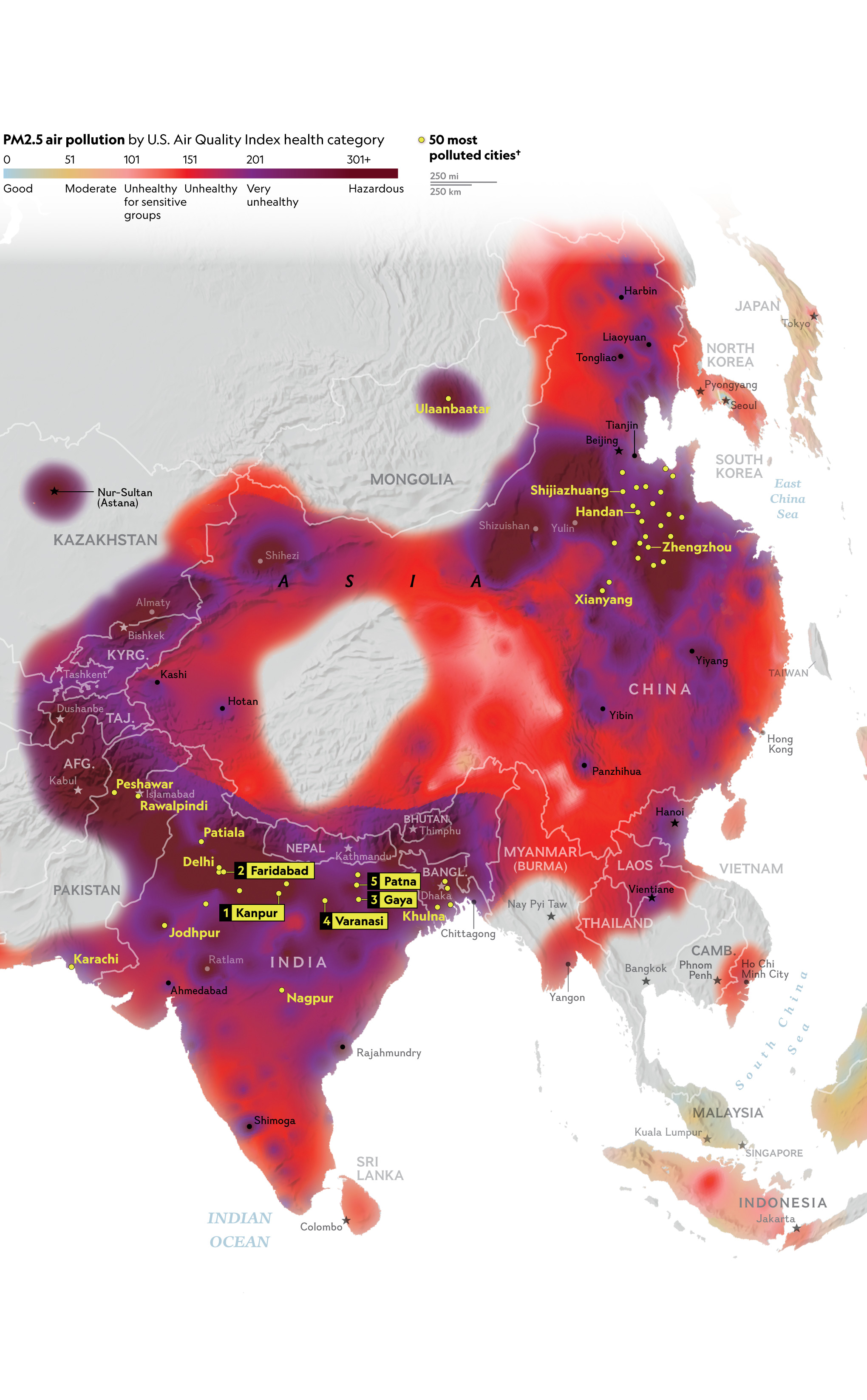 People in some of the world’s most populous countries—China, India, Pakistan— breathe the most polluted air. This map shows readings of PM2.5, or fine-particulate matter, recorded over several months in 2020, with the highest readings selected for each place. Of the world’s 50 most polluted cities, nearly all are in Asia.