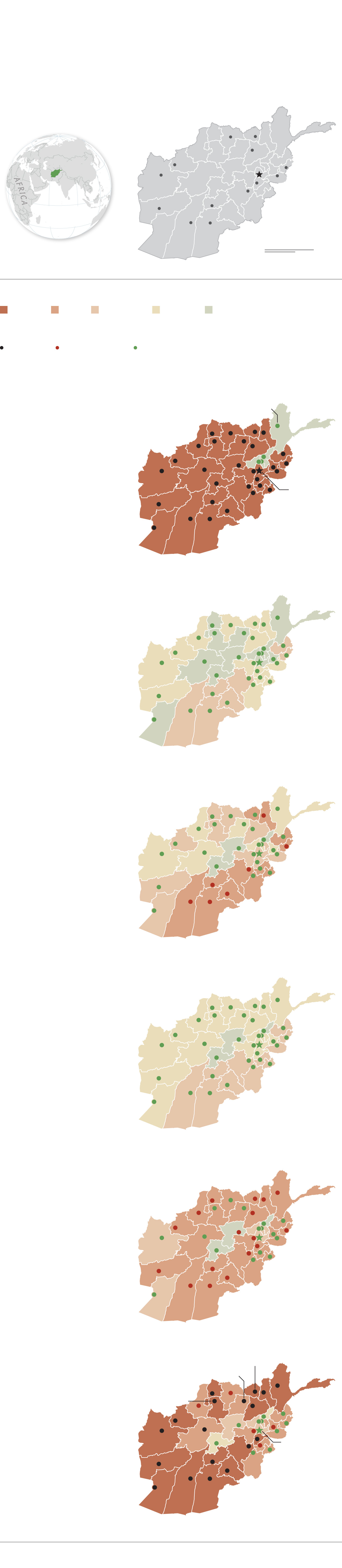 The Taliban regain large areas after NATO turns primary security over to the Afghan military in 2014. The U.S. pledges a full withdrawal by September 11, 2021.